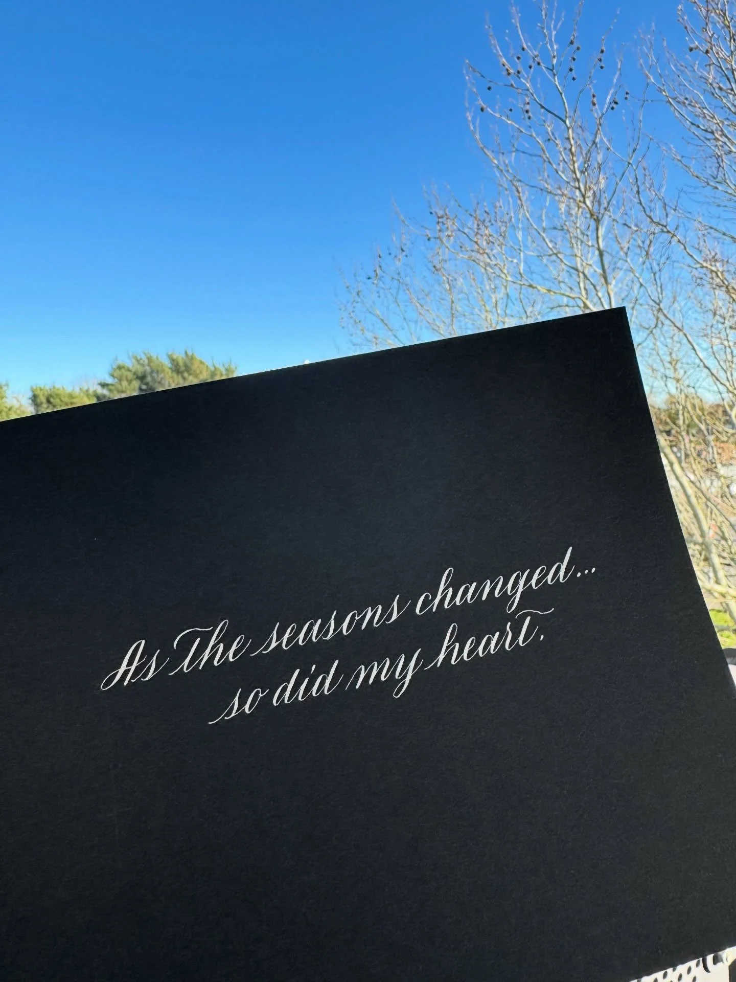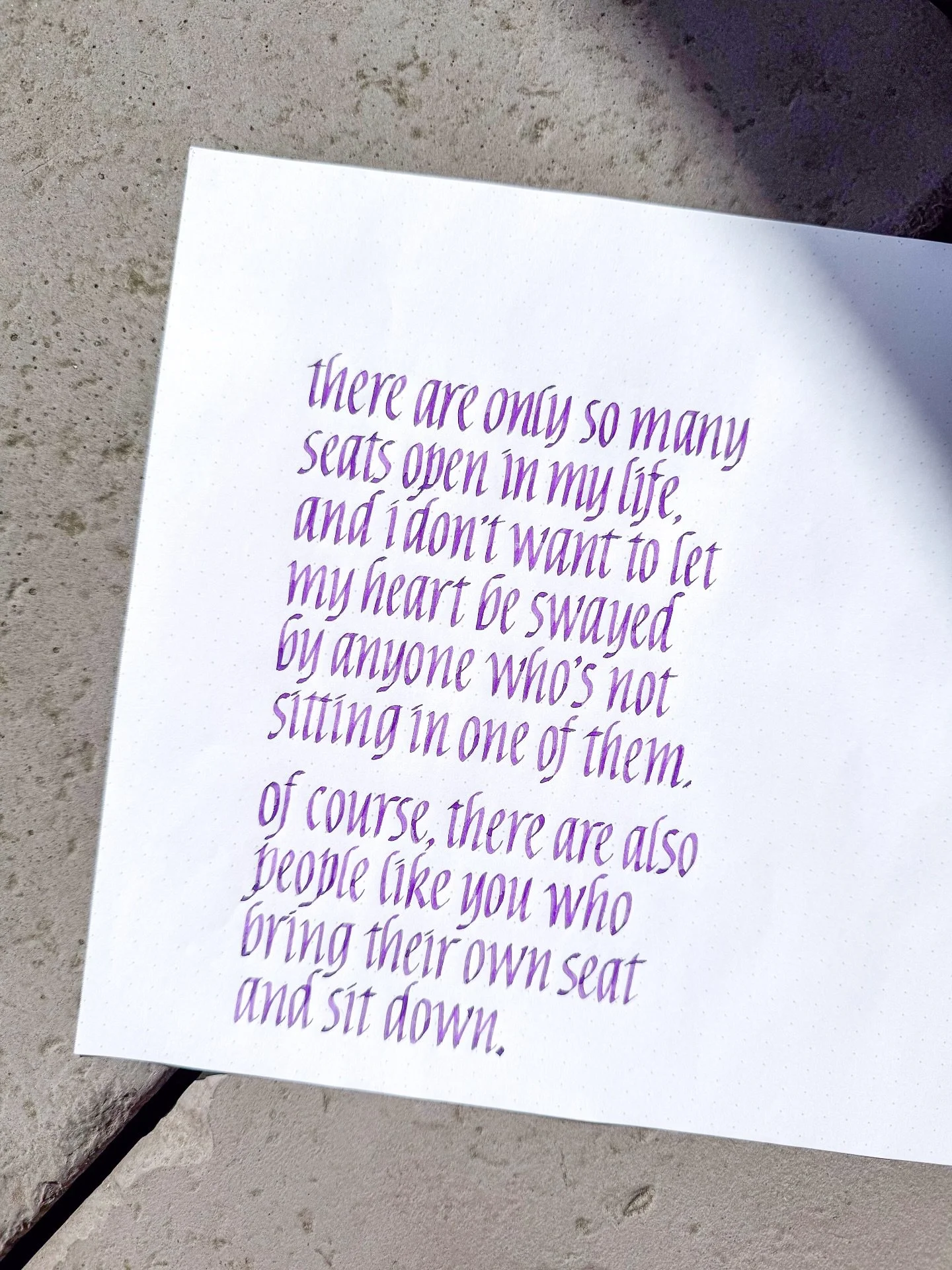 I attended my first pointed pen workshop in 2014 and as the cliché goes, the rest is history. I eventually found my way to Copperplate calligraphy and fell in love with the classic style of writing. I went on to study Spencerian script in 2018.